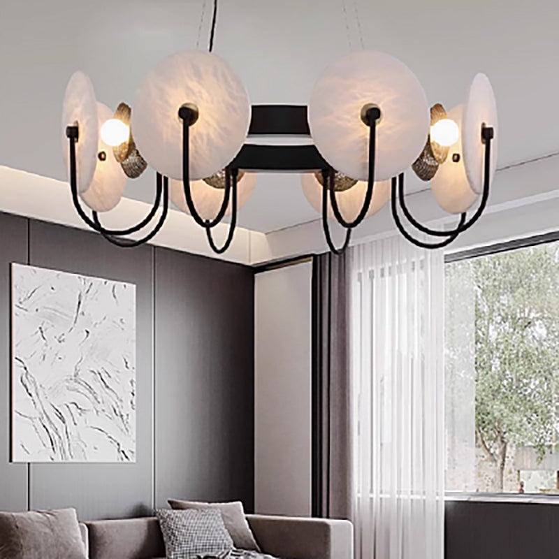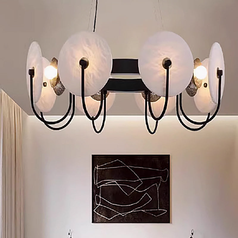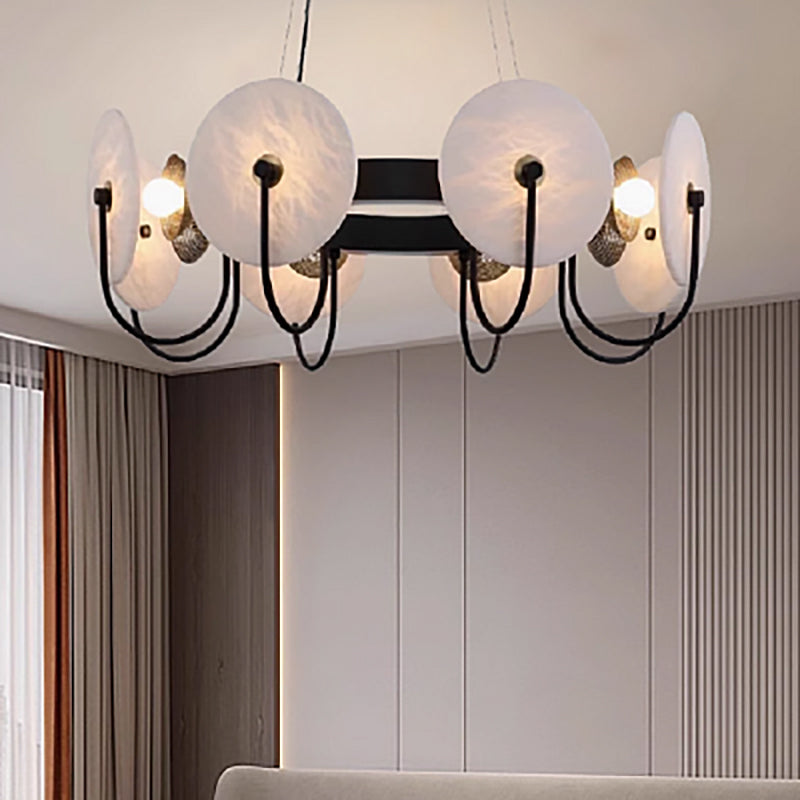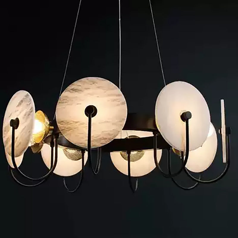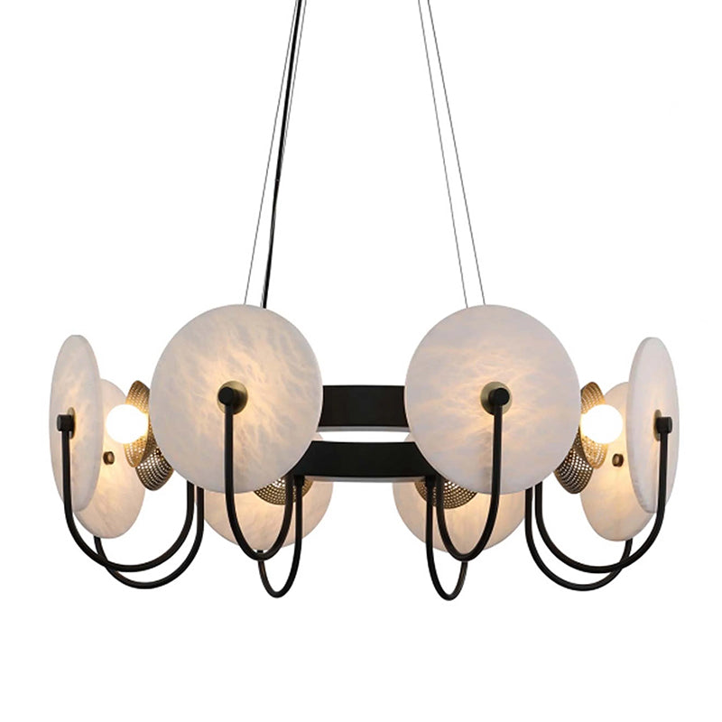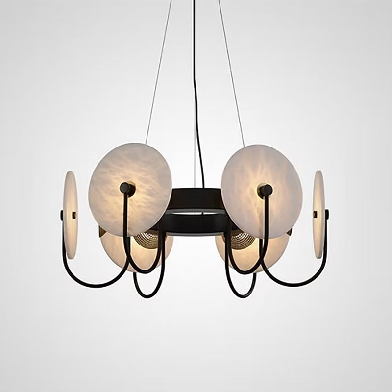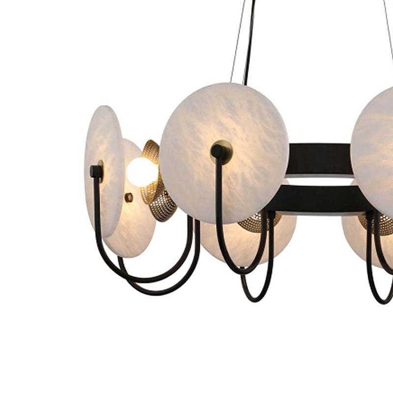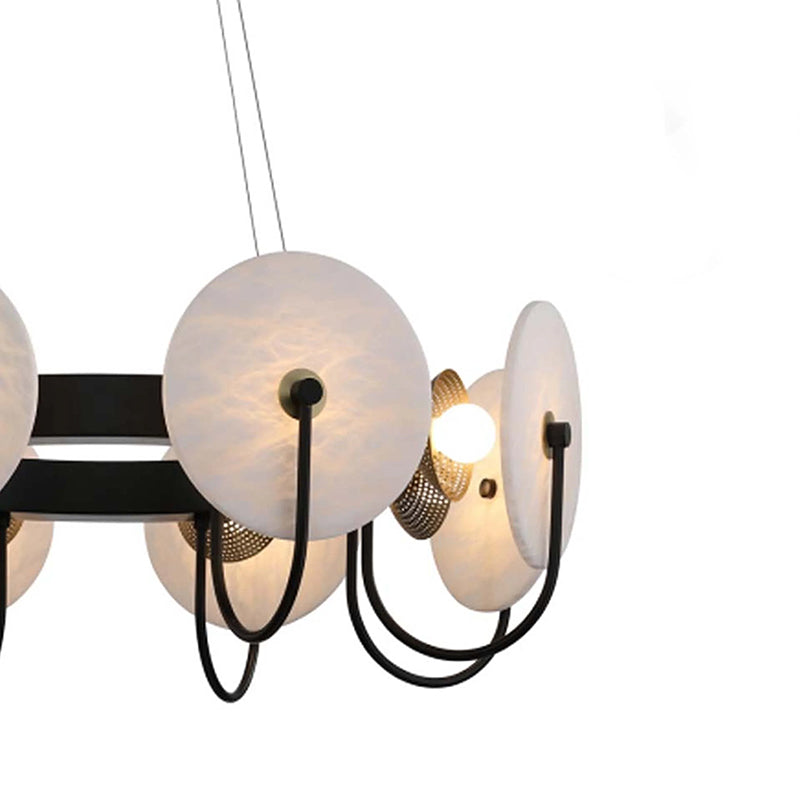 Ring-shaped pendant lamp with a natural marble disc-shaped diffuser and an arched base