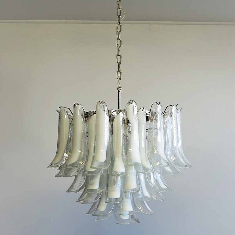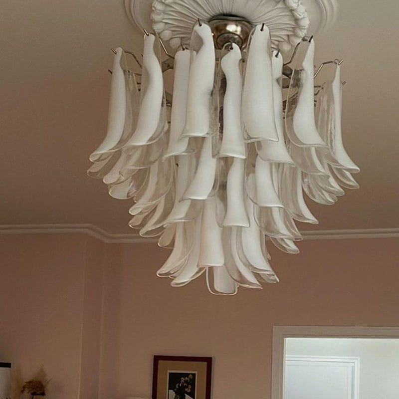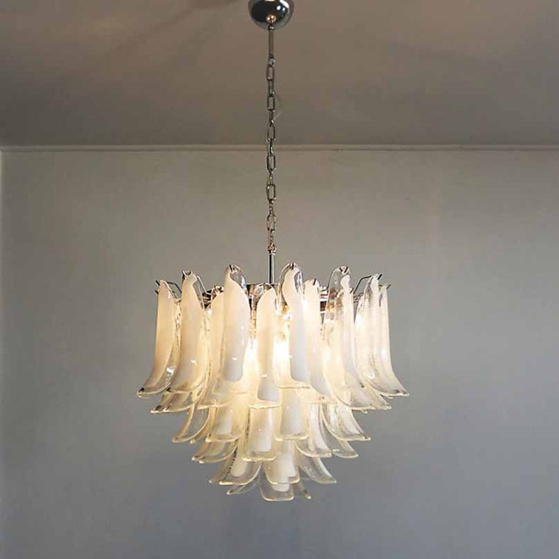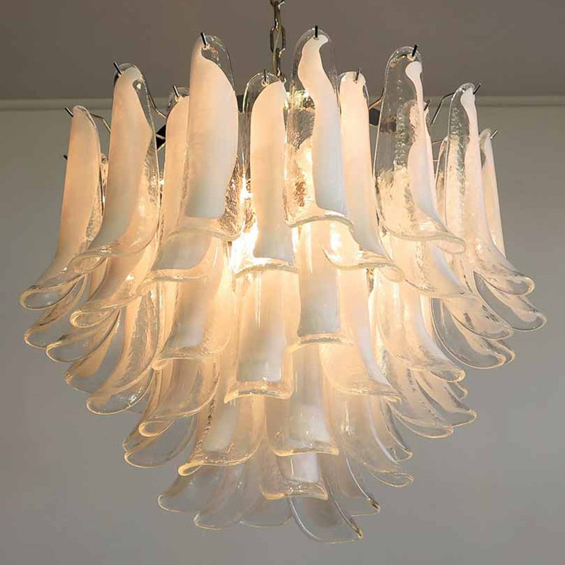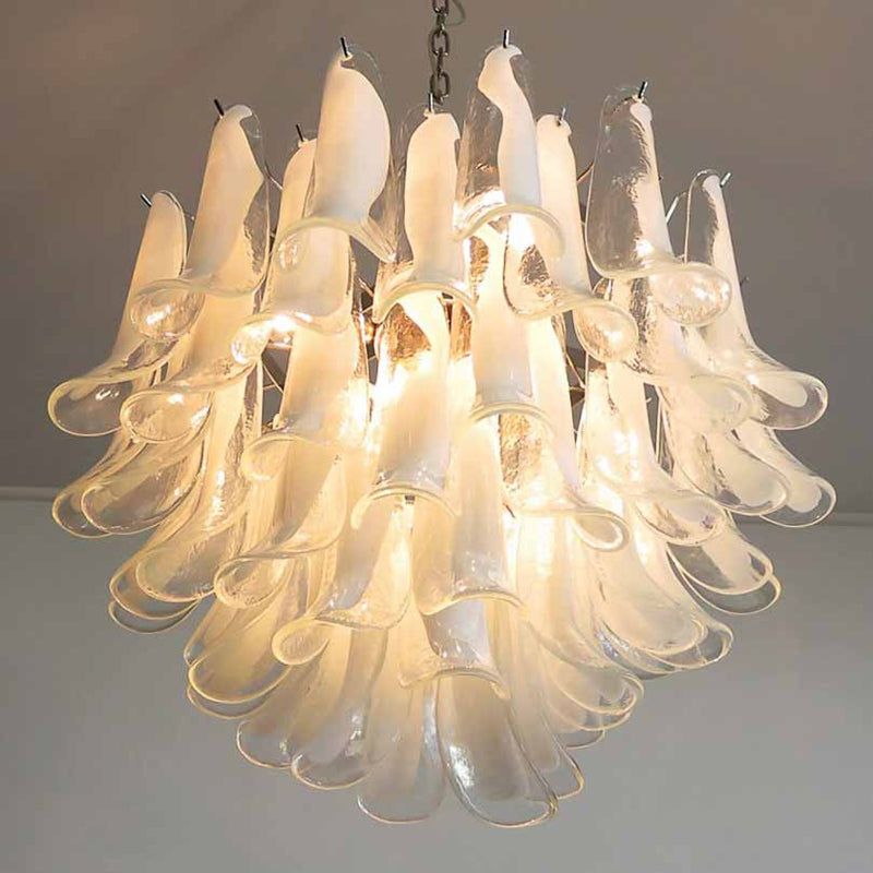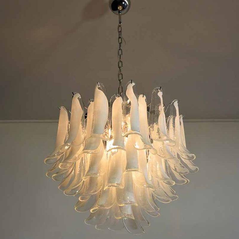 This large white petal Murano chandelier showcases exquisite craftsmanship with hand-blown Murano glass petals arranged in an elegant, flowing design. Its luminous white finish diffuses light softly, creating a refined ambiance that enhances both classic and contemporary interiors. Ideal for grand entryways or spacious living areas, this chandelier serves as a statement piece that marries artistic heritage with sophisticated lighting.