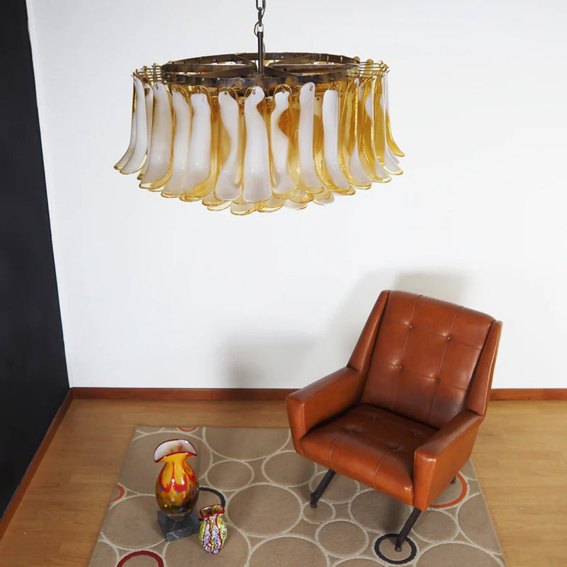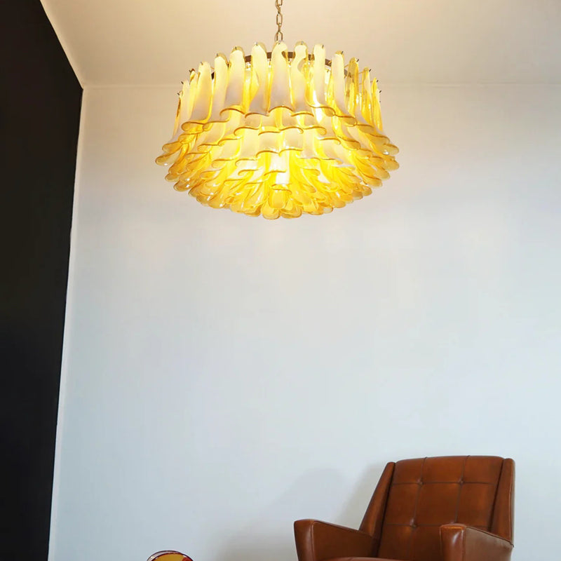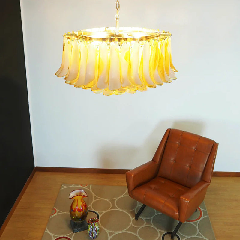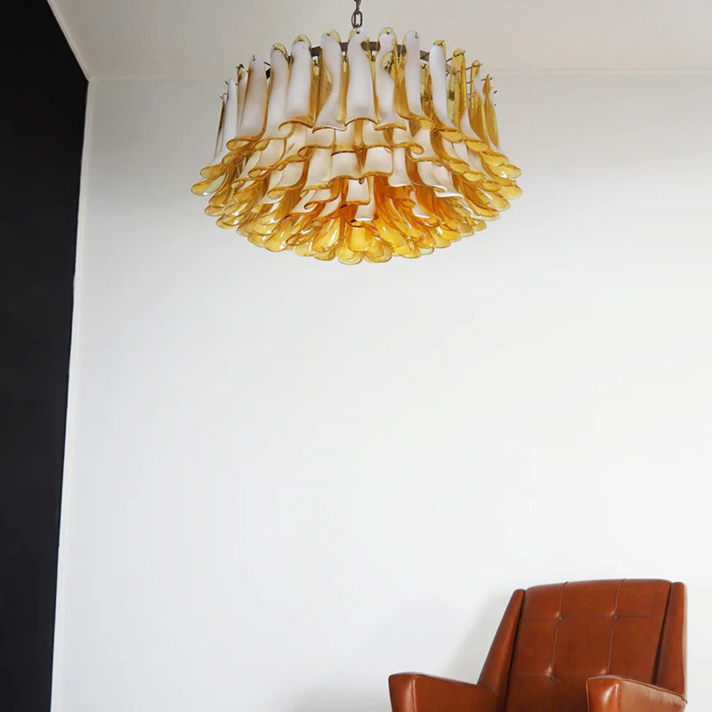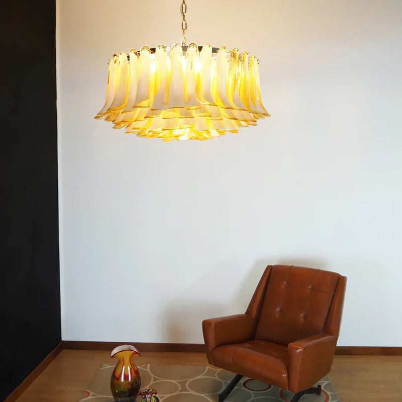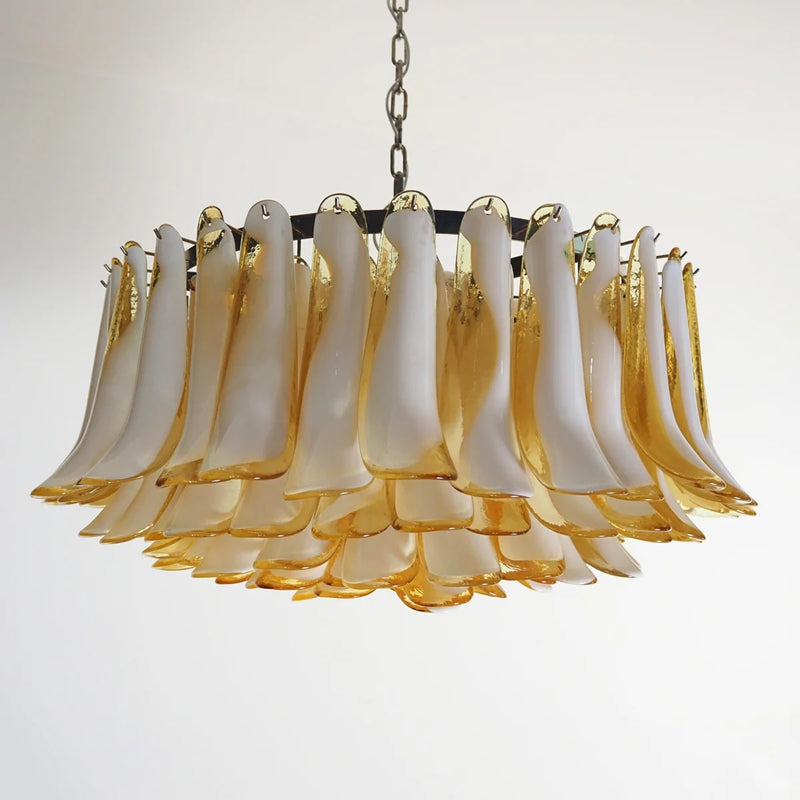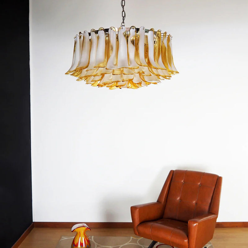 The Murano Caramel Glass Petal Chandelier showcases expertly crafted Murano glass petals in warm caramel tones, creating a sophisticated centerpiece that merges art and light. Each petal is carefully shaped and assembled by skilled artisans, delivering a unique, radiant glow that enhances any space with elegance and depth. Ideal for those seeking refined ambiance, this chandelier combines timeless craftsmanship with contemporary design to elevate your interior effortlessly.
