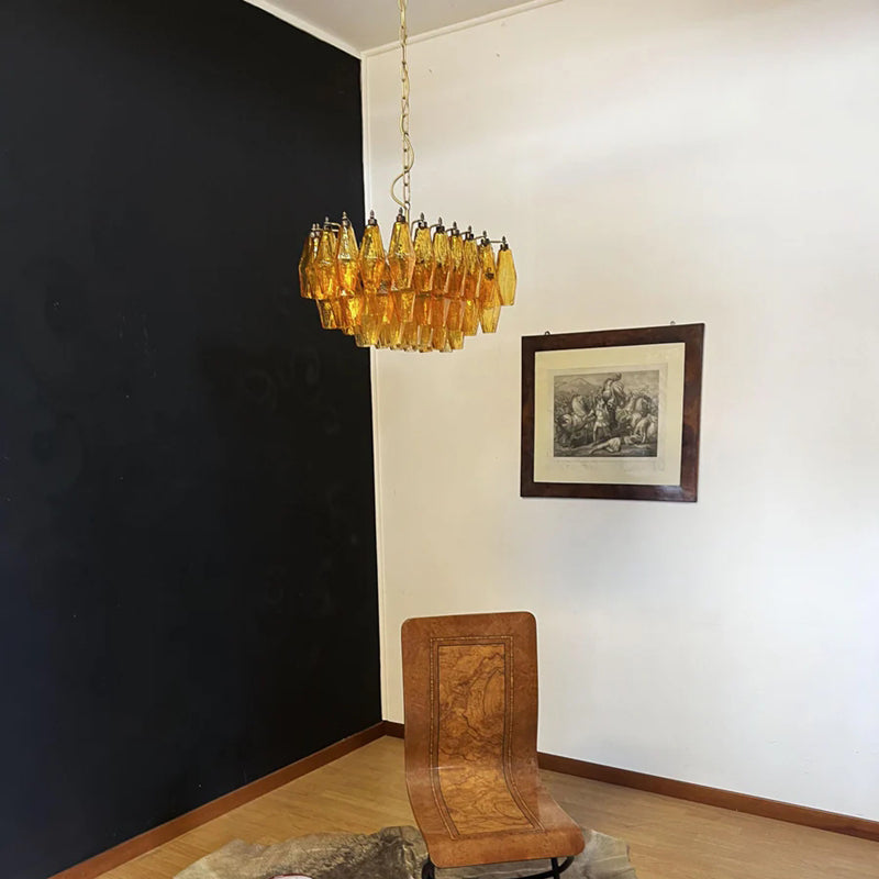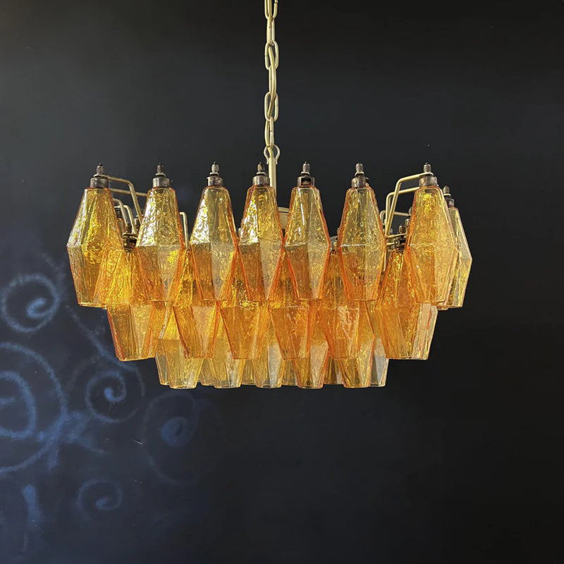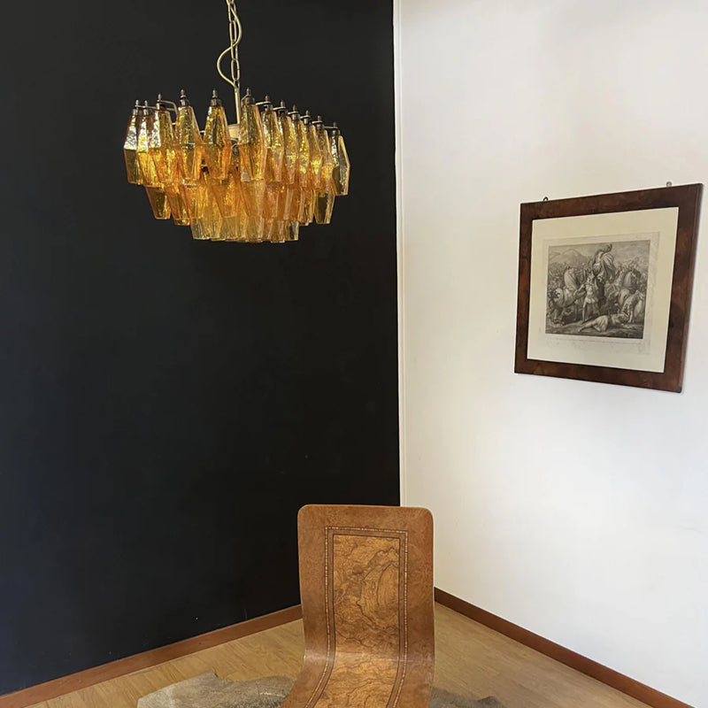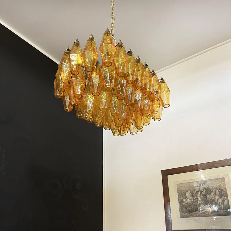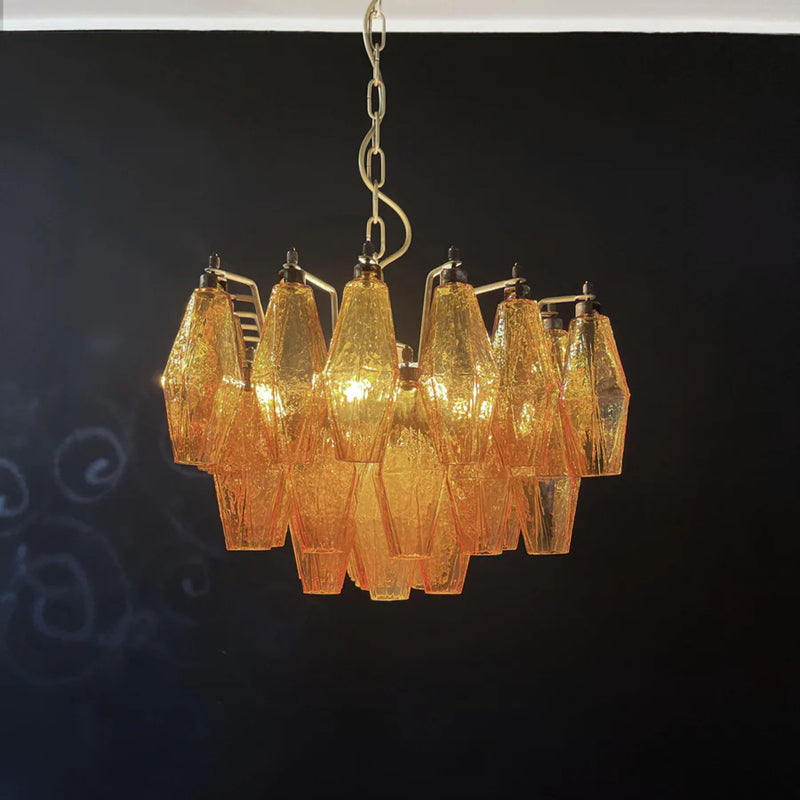 The Poliedri Murano amber chandelier represents a masterwork of Venetian glassmaking tradition. Hand-crafted from authentic Murano glass, each geometric facet captures and refracts light with remarkable depth, creating an ever-shifting interplay of warm amber tones throughout your space. The sculptural polyhedral design combines contemporary geometry with timeless Italian craftsmanship, making it an architectural statement piece. Ideal for sophisticated interiors seeking both artistic presence and refined illumination.