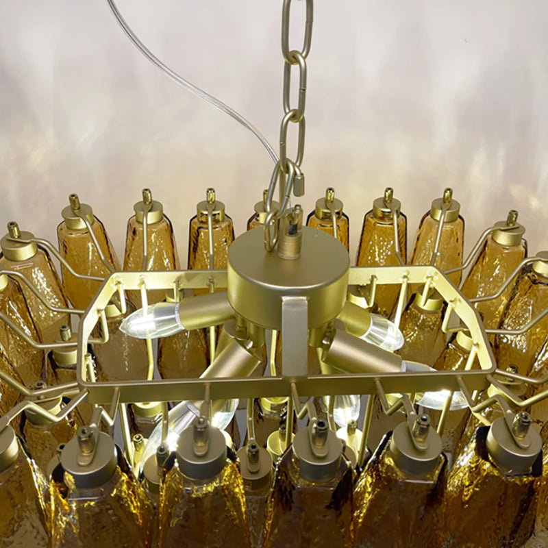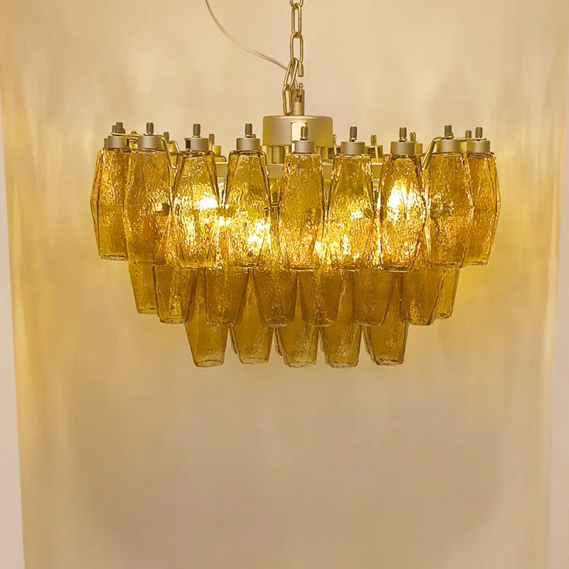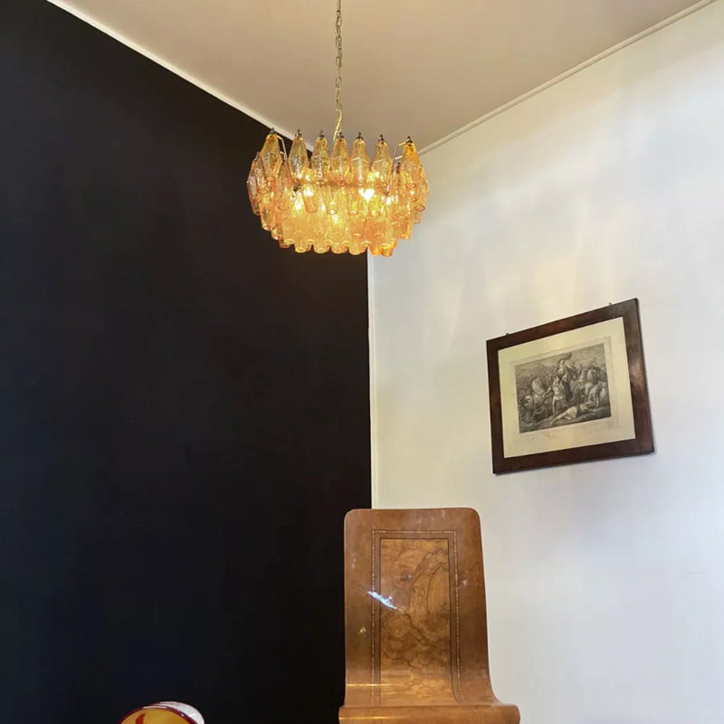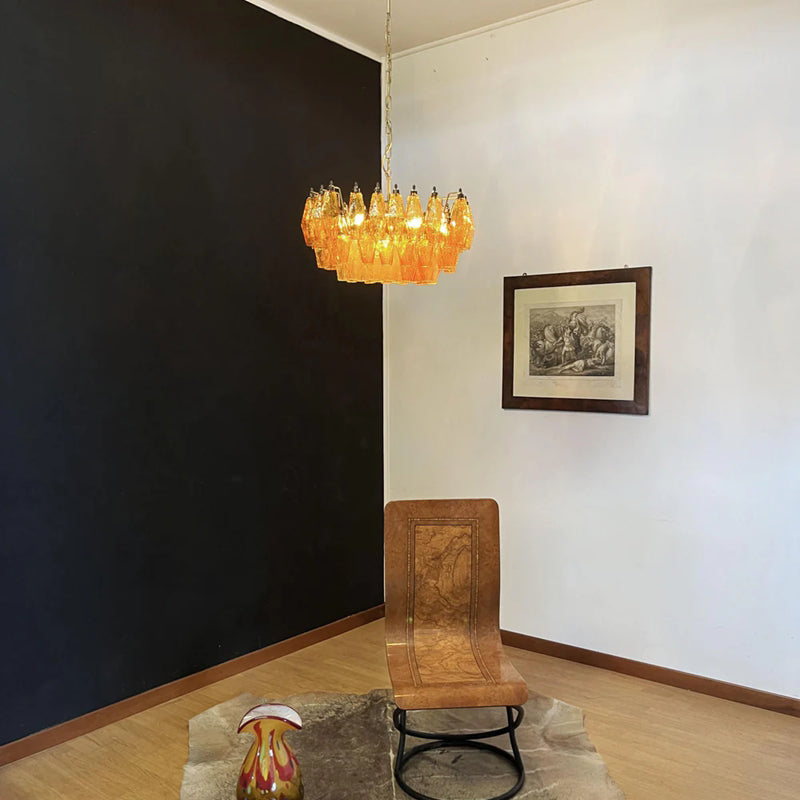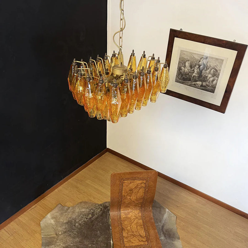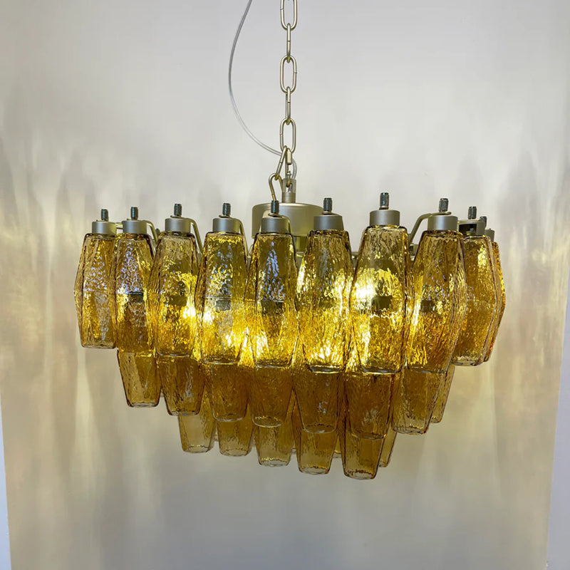 The Poliedri Murano amber chandelier represents a masterwork of Venetian glassmaking tradition. Hand-crafted from authentic Murano glass, each geometric facet captures and refracts light with remarkable depth, creating an ever-shifting interplay of warm amber tones throughout your space. The sculptural polyhedral design combines contemporary geometry with timeless Italian craftsmanship, making it an architectural statement piece. Ideal for sophisticated interiors seeking both artistic presence and refined illumination.