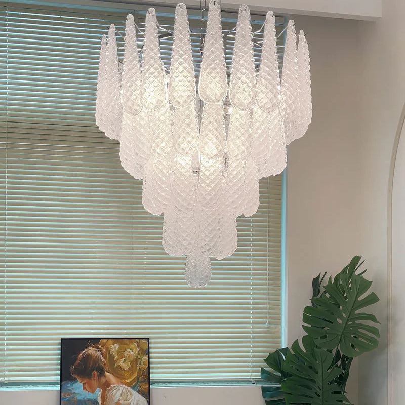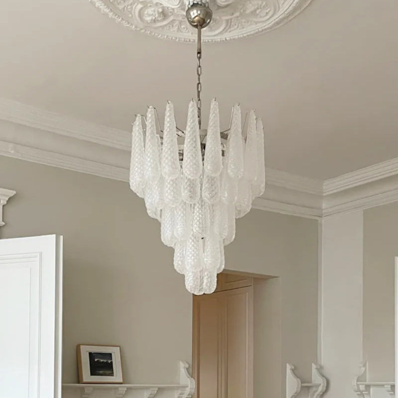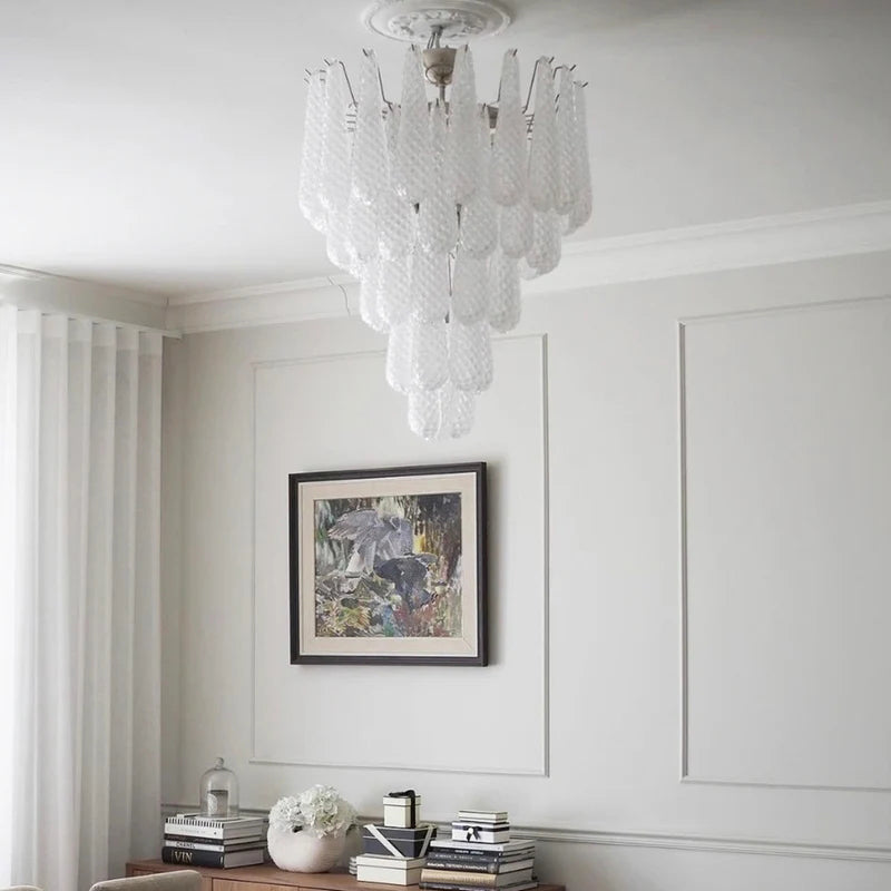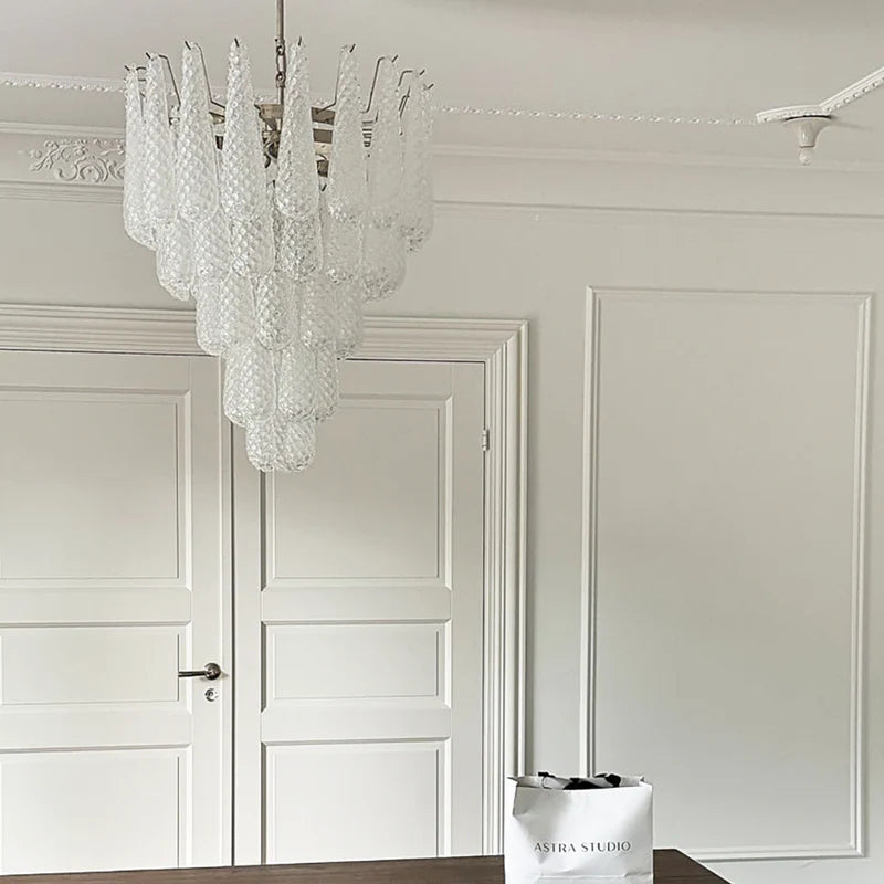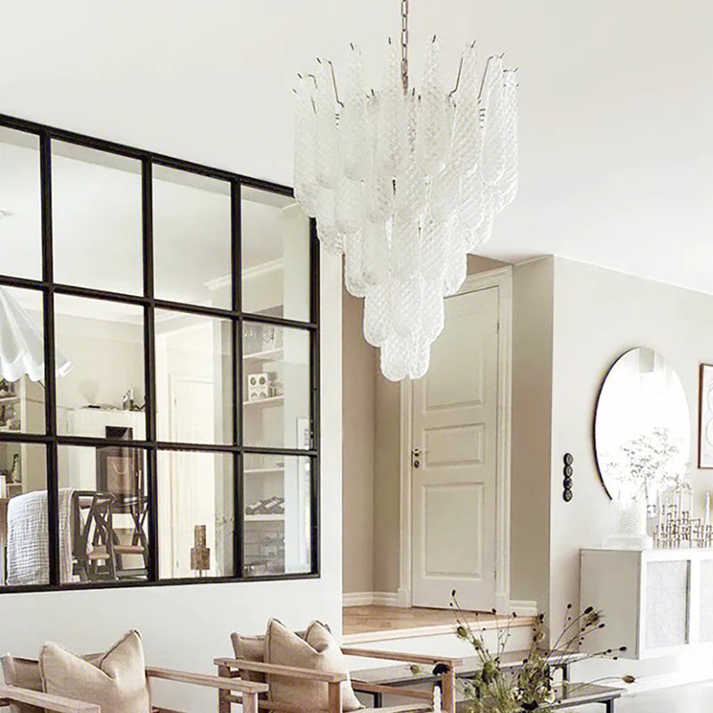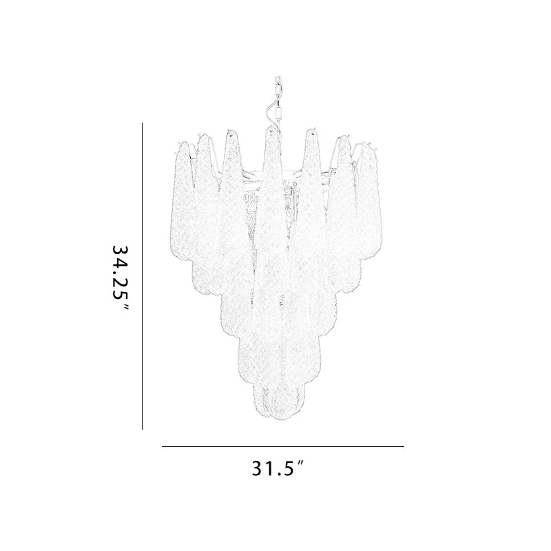 This exquisite chandelier showcases authentic Murano glass craftsmanship, featuring delicate petal-shaped elements in pristine clear glass that refract light beautifully throughout any space. Each petal is meticulously hand-formed using traditional Venetian glassmaking techniques, creating organic movement and visual depth. The transparent design allows light to cascade elegantly, casting luminous patterns that enhance both modern and classical interiors. Perfect for entryways, dining rooms, or living spaces where sophisticated illumination is desired. A statement piece that combines timeless artisanal quality with contemporary elegance.