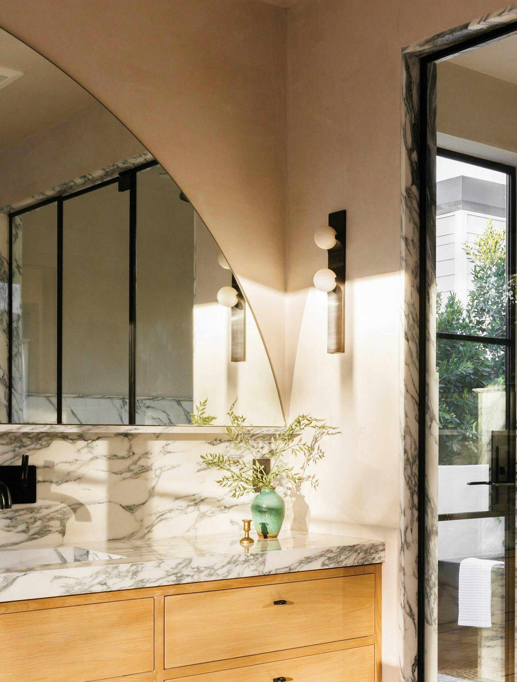 This wall lamp has a simple and modern design. The main frame is made of copper, which presents a calm texture and good durability. The two spherical lampshades are made of alabaster. Its translucent properties can make the light diffuse softly, creating a warm atmosphere. It is both beautiful and practical, suitable for adding style to home or commercial space.