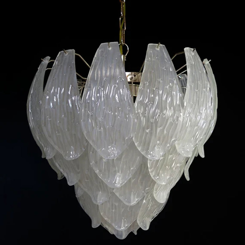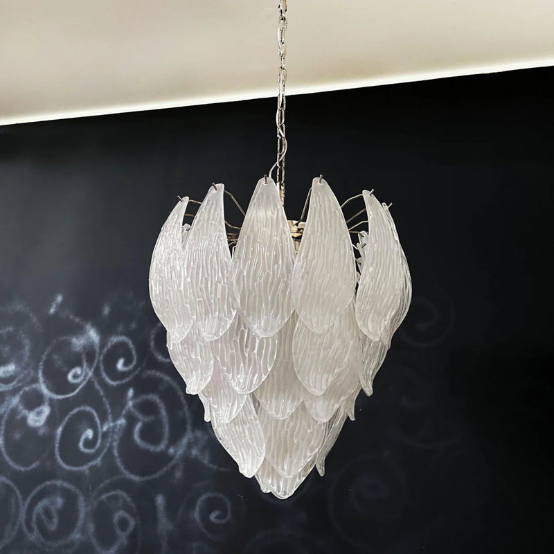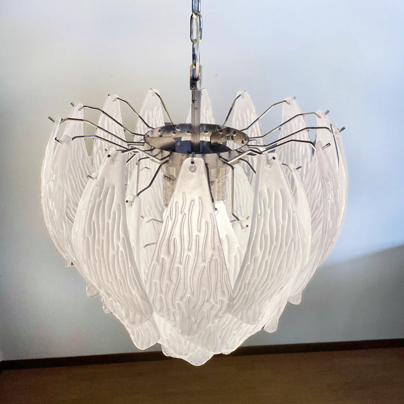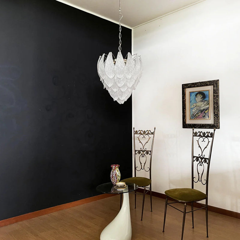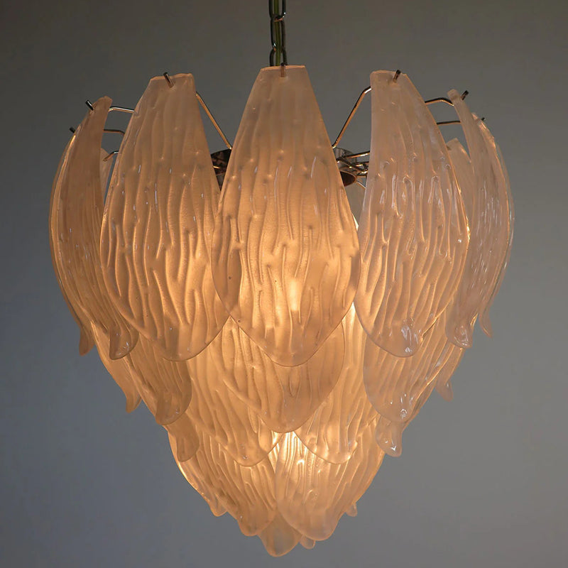 The Murano frosted cut glass leaf chandelier combines expert craftsmanship with elegant design. Featuring delicately cut frosted glass shaped like leaves, this chandelier adds a refined touch to any space. Its soft diffusion of light creates a warm, inviting atmosphere while showcasing artisan quality typical of Murano glass. Perfect for those seeking a sophisticated centerpiece that balances classic artistry with modern illumination.