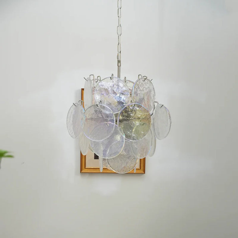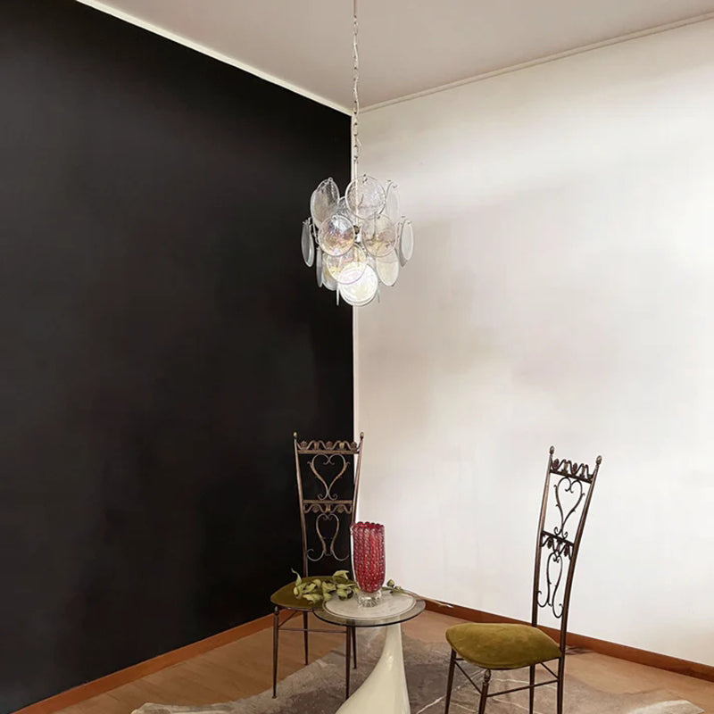 Elevate your space with this Vintage Murano iridescent glass disc chandelier, a masterful blend of artistry and elegance. Comprising delicate, hand-crafted Murano glass discs that shimmer with an iridescent finish, this chandelier offers a unique glow that enhances ambient lighting. Its vintage design reflects expert craftsmanship, providing a timeless focal point that complements both classic and contemporary interiors. Ideal for sophisticated living areas or dining rooms, this fixture brings refined style and subtle luminosity to any room.