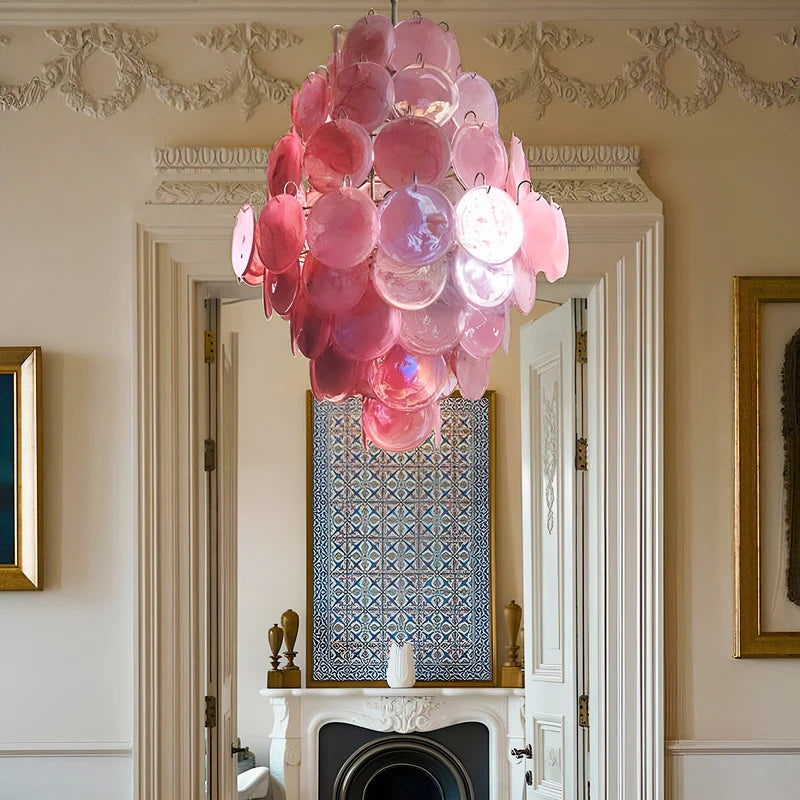 The Vintage Murano Pink Cloud Disc Chandelier showcases artisanal Murano glass craftsmanship with delicate pink discs arranged to evoke a soft cloud-like form. This statement fixture combines timeless elegance with expert design, offering ambient light that enhances any interior with a refined, artistic touch. Ideal for those seeking a distinctive, handcrafted centerpiece that balances vintage charm and sophisticated style.